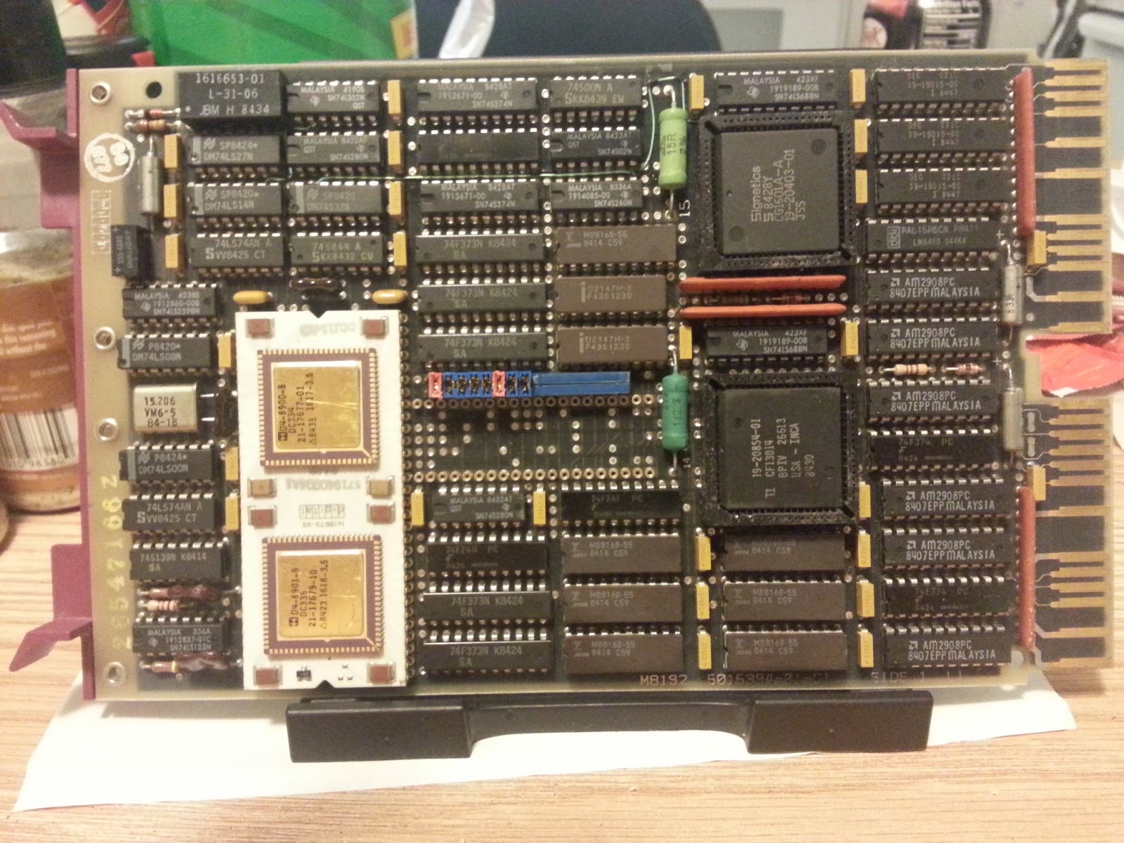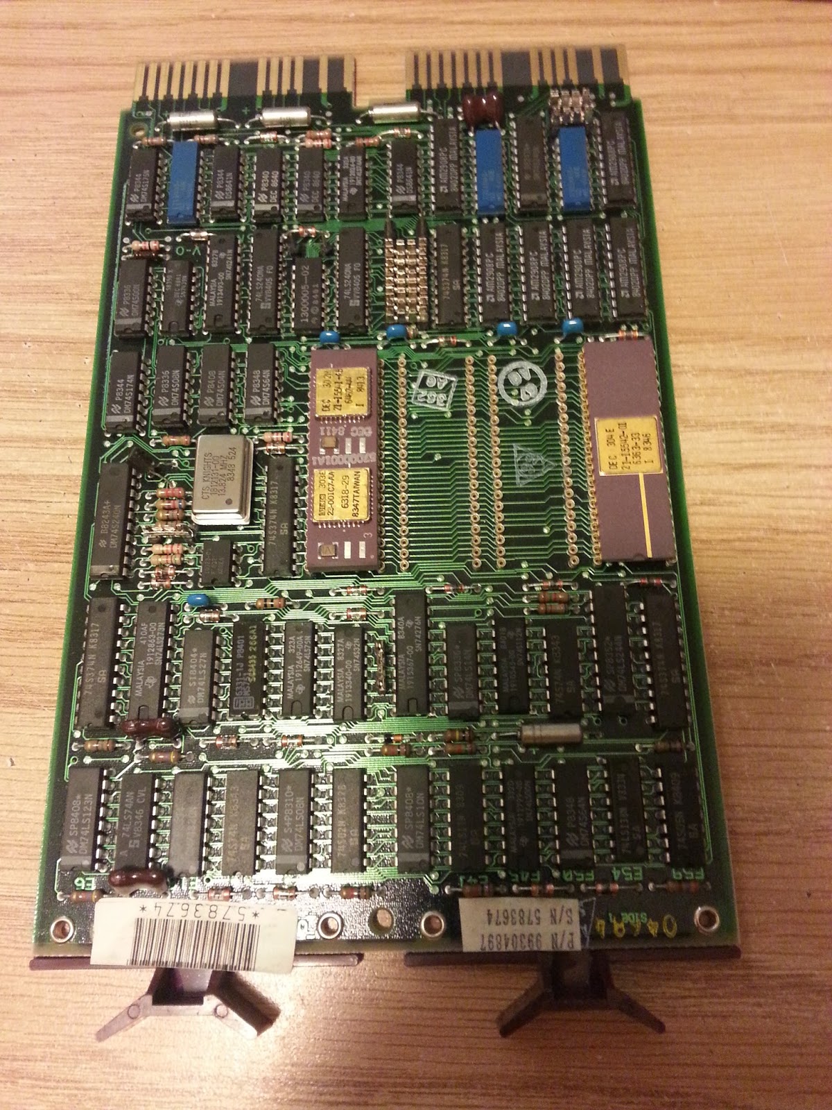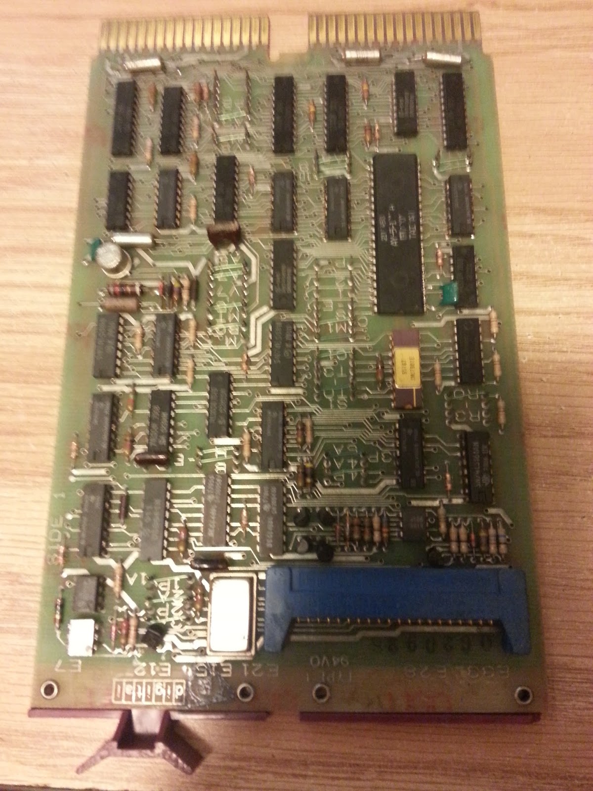 For the following two boards, both KDJ11-A boards, the date codes are near end of 1983 and all of the edge pins are present. Note the one in the next illustration has the unused pins omitted.